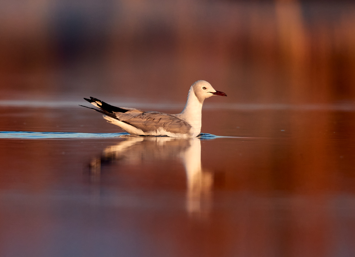 I quickly moved to the other side of the road where the sun was now behind me and this worked very well, especially with the beautiful orange glow of the breaking dawn on the opposite bank and reeds reflected beautifully in the water. The light was soft and did not blow out the whites of the waterfowl and the many gulls that were also present.