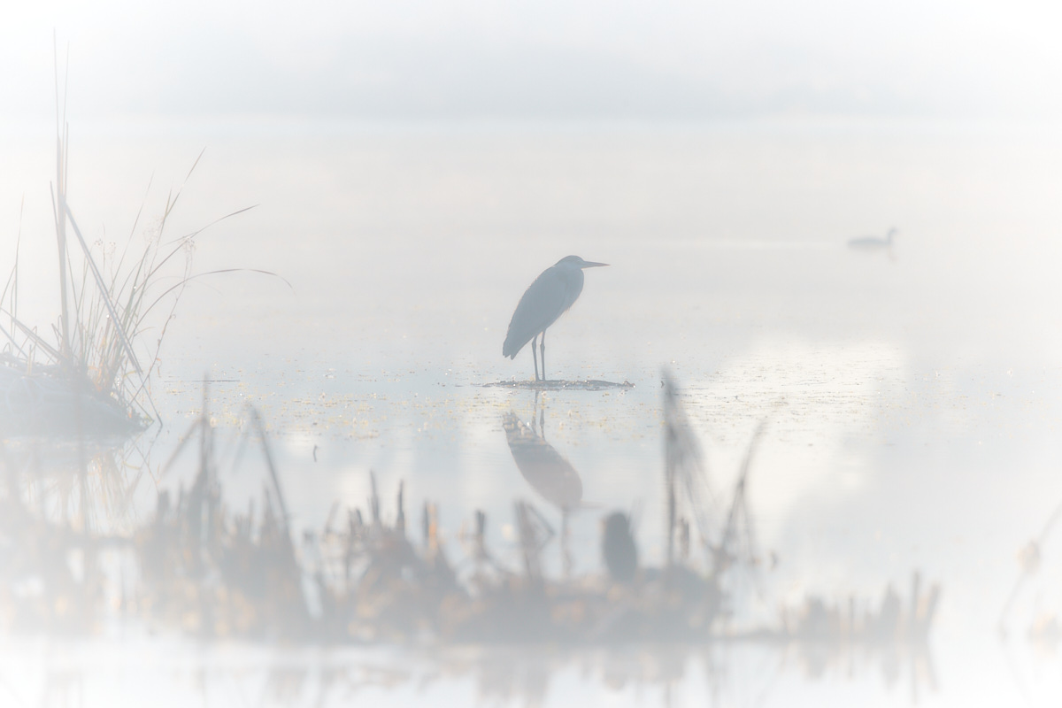 Once the sun started to rise, the morning mist unfortunately also came up due to the freezing temperatures and with the light behind the mist, it was impossible to get any decent images. I nevertheless took the opportunity to capture a moody image of this Heron standing freezing in the mist.